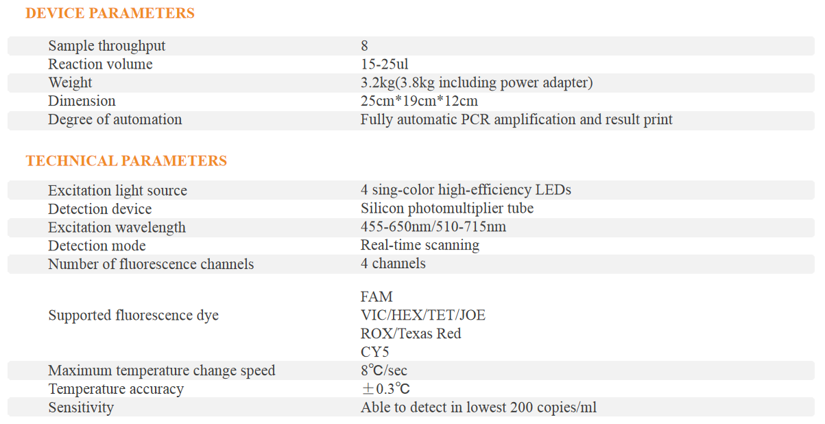 Instruction: Baicare Ultrafast QPCR Detection system FQ-8A adopts "real-time fluorescent quantitative PCR technology" combined with "real-time dynamic temperature control technology", which can be used in various fluorescent quantitative PCR detection projects to achieve rapid nucleic acid detection. With powerful functions and flexible operation, PCR amplification and detection experiments of DNA and RNA can be completed in a compact and portable environment. With the anti-pollution open lid design, Baicare Ultrafast QPCR detection system provides a easy, fast and safe experimental operation. Combine with the efficient PCR Detection Kit and Neuclec Acid Releaser, Baicare provides the complete solution for SARS-CoV-2 Testing and other projects.