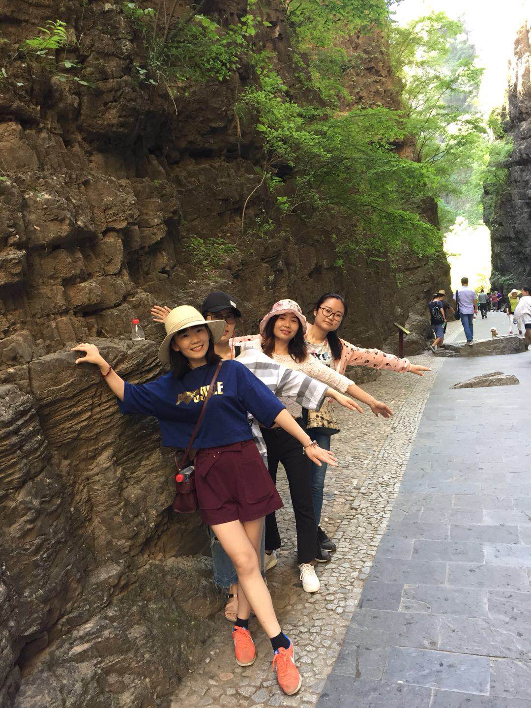 團建活動part 4:游覽“天下第一峽” 團建第二天我們要去到的是被譽為“天下第一峽”的百里峽景區(qū),聽聞百里峽天梯有三千余階,可是嚇?biāo)馈皩殞殏儭蹦兀液媒?jīng)過一夜的休息,大家精力已恢復(fù)大半。 走在狹窄的峽谷中,駐足而望,兩側(cè)聳然屹立的翠色絕壁,頭頂上若隱若現(xiàn)的一線天光,遠(yuǎn)處山巔的藍天白云,腳下忽左忽右的溪流……若不是那彩色纜車過于美好,“小芯”肯定是要徒步登上山頂?shù)模]錯,“小芯”真的是被纜車“色誘”過去的!!!